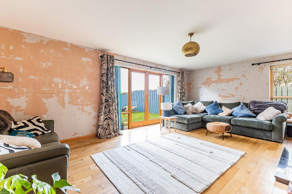 6.38m x 4.18m (20' 11" x 13' 9") Spacious living room currently awaiting decoration, open fireplace, double doors out to the enclosed rear all with stunning coastal lough sea views to enjoy.