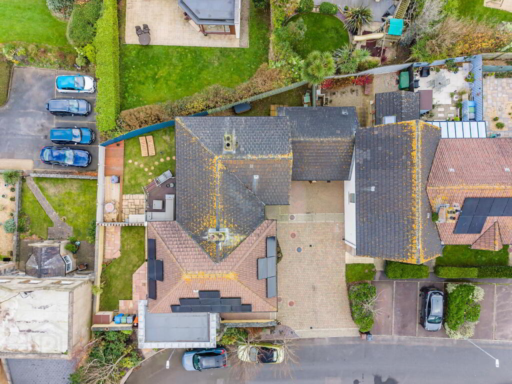 The front provides a car parking space in brick pavior leading to the integral garage.