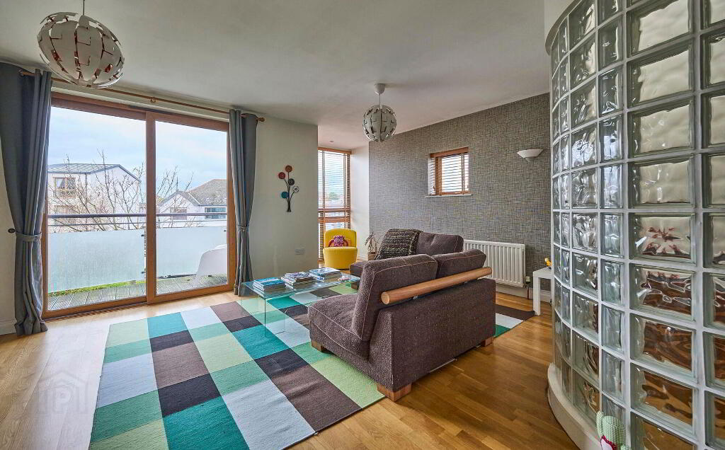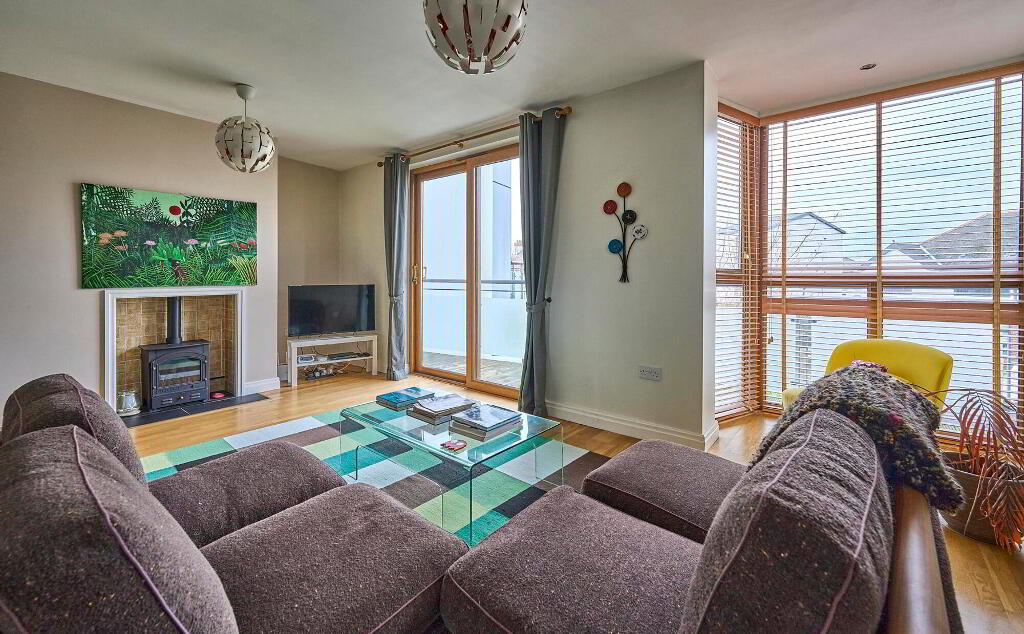 5.21m x 7.21m (17' 1" x 23' 8") Narrowing to 9'00". Hole in wall style fire place with slate hearth, wired for wall lights, sliding doors to balcony. Open plan to kitchen.