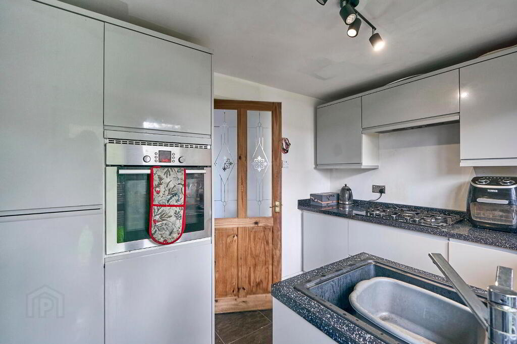 3.16m x 2.52m (10' 4" x 8' 3") Fitted kitchen with a range of hi and low level white gloss units, built in gas hob/oven and fridge freezer.
