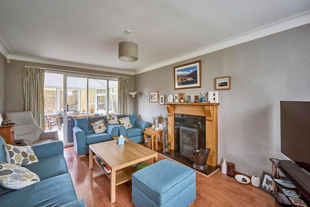 5.25m x 3.34m (17' 3" x 10' 11") Spacious living room with open fireplace and sliding door into the sunroom.