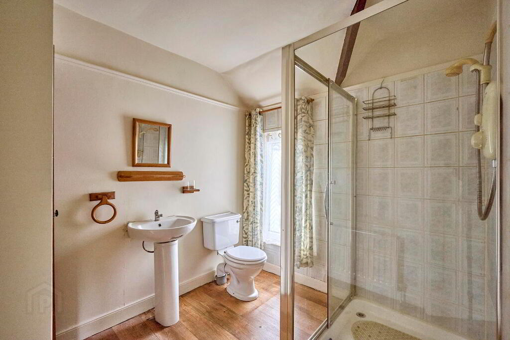 Three piece bathroom suite consisting of w/c, sink and walk in shower with electric shower unit.