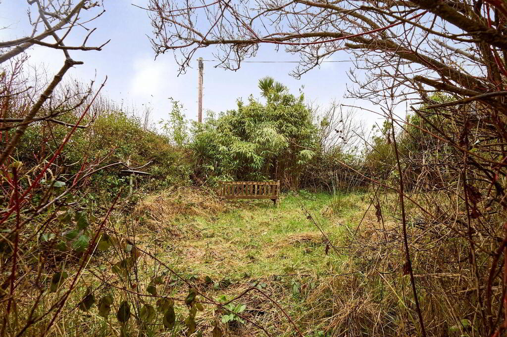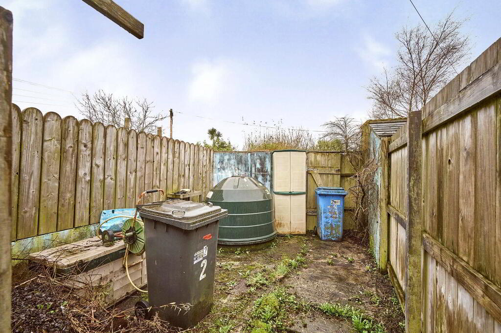Generous rear enclosed yard leads to a separate spacious garden with hedging.