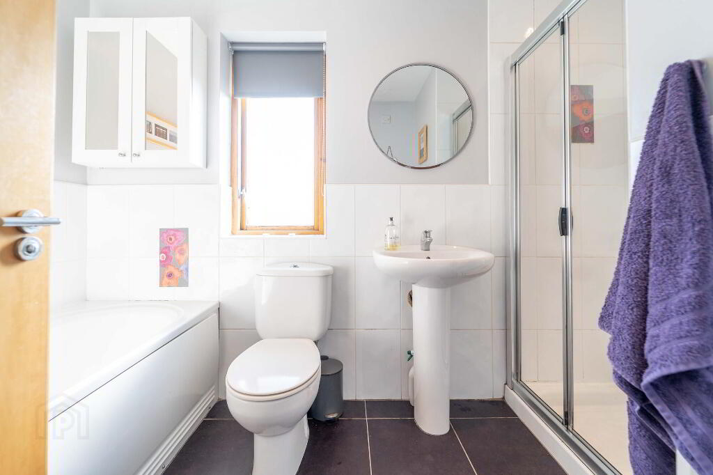 Four piece bathroom suite consisting of a sink, w/c, bath and separate shower cube with mains shower.
