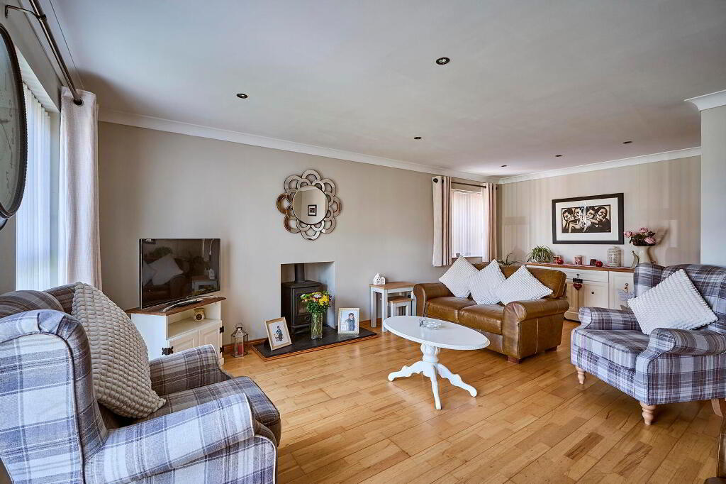 6.06m x 4.44m (19' 11" x 14' 7") Spacious well presented living room with multi stove burner and solid wood flooring.