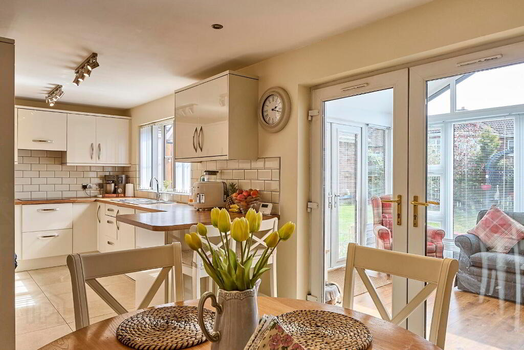 6.58m x 2.95m (21' 7" x 9' 8") Luxury fitted kitchen with a range of hi & lo level units complemented with built in hob and double oven, fridge freezer and dish washer, tiled flooring opening into the dining area with pvc double doors into the sun room.