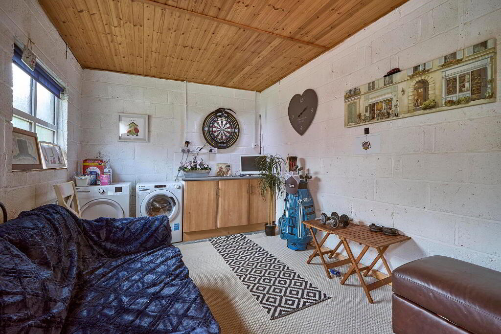5.7m x 2.88m (18' 8" x 9' 5") Well proportioned garage with a convenient utility area plumbed for a washing machine and a main roller shutter door.