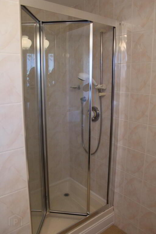 Three piece suite consisting of a w/c, sink, double shower with mains shower unit & tiled walls.