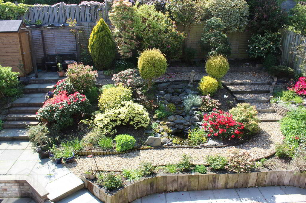 Mostly South facing rear in a fantastic display of rockery with small flower beds and shrubbery and patio area.